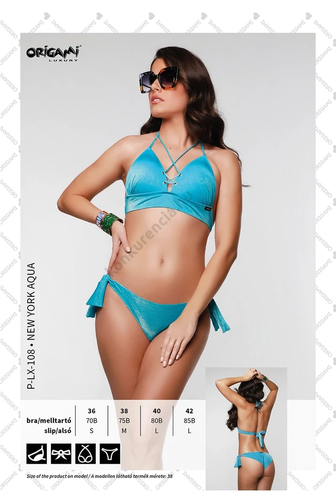 Az Origami fürdoruhákat az egyedi tervezése és designja teszi igazán különlegessé! Minden évben izgalmas és különleges kollekcióval lepnek meg minket! A fiatalok és idosebbek is egyaránt megtalálhatják a számukra legmegfelelobb darabot. Az alábbi típus eloformázott, push-up kosaras háromszög fazonú. Nyakban és hátul megkötos. A bugyija megkötos, ráncolt hátuljú csípo fazonú. Anyaga : 80% poliamid,