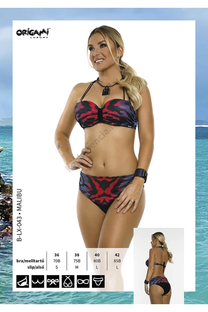 Az Origami fürdoruhákat az egyedi tervezése és designja teszi igazán különlegessé! Az idei kollekció minden képzeletet felülmúlt! A fiatalok és idosebbek is egyaránt megtalálhatják a számukra legmegfelelobb darabot. Az alábbi típus felsorésze merevítos, bandeau fazonú, push-up formakosárral. Az alsó része hajtogatható derékbugyis, állítható derékrésszel. Anyaga : 80% poliamid, 20% elasztán.